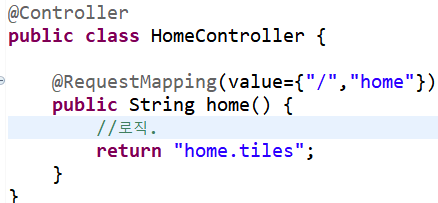 앞서 tiles의 설정파일에서 jsp명.tiles 로 페이지를 처리하도록 했기때문에 return에 뷰값을 넘겨줄땐 tiles를 붙여주면서 처리하면된다.