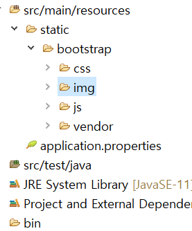 부트스트랩 템플릿 적용을 위해선 우선적으로 템플릿에 적용돼 있는 각종 js, img, css 파일이 static 폴더 안에 있어야한다.