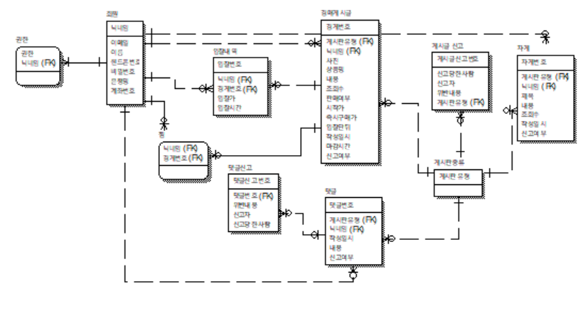 혼자서 설계해본 1차로 만든 ERD이다. 게시판 종류 테이블을 따로 추가한 이유는 게시판이 경매게시판, 자유게시판으로 나눠져 있기 때문이고, 각 게시글판 마다 신고나 댓글 테이블을 만들지 않고 게시판 종류 테이블을 부모테이블로 해서 게시글 신고 및 댓글에 대해 하나의 테이블로 관리할 생각이다.
