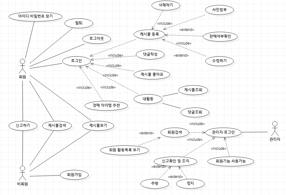 1차 유즈케이스 다이어그램으로 대략적인 사용자 기능들 중심으로 만들어봤다.