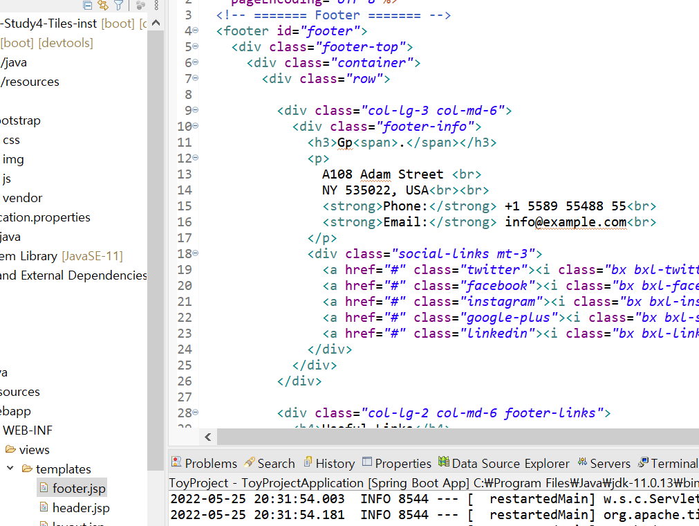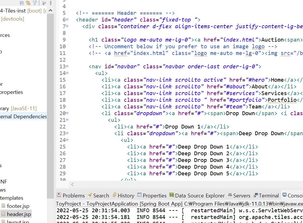 html파일에서 하나로 돼있던 헤더섹션과 풋터섹션을 따로 header.jsp , footer.jsp 파일에 넣어준다.