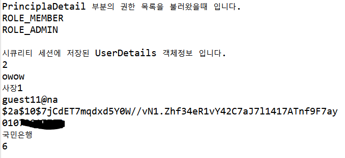 4. 로그인하고 로그인한 유저의 정보를 볼수 있는게 한정됨 -> UserDetails를 만드는 과정에서 gettersetter를 이용해 필요한 정보 전부 만들기.