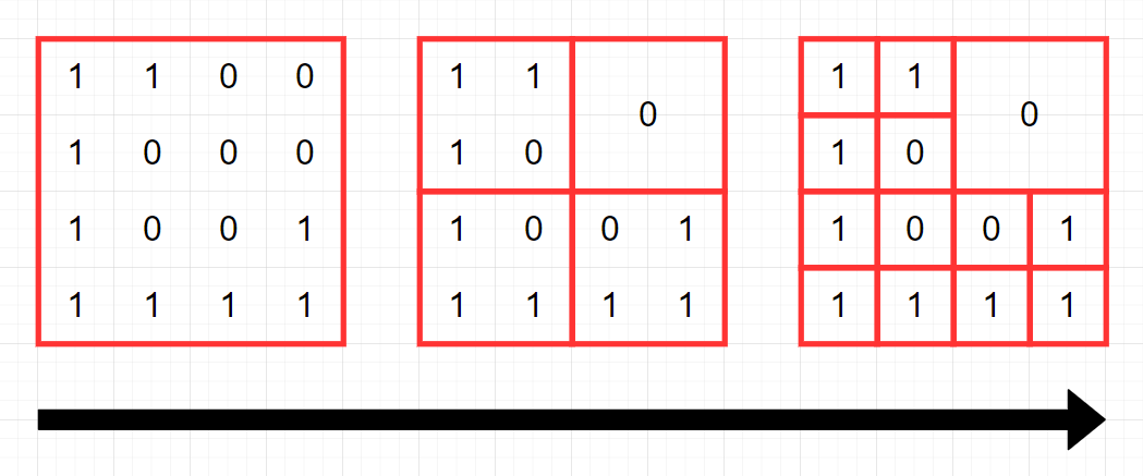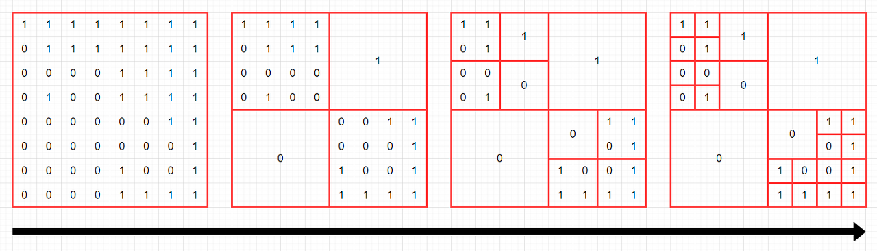 - 그렇지 않다면, S를 정확히 4개의 균일한 정사각형 영역(입출력 예를 참고해주시기 바랍니다.)으로 쪼갠 뒤, 각 정사각형 영역에 대해 같은 방식의 압축을 시도합니다.