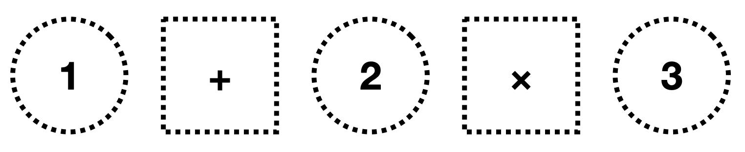 예를 들어 정수 1, 2, 3이 있고 더하기 연산자와 곱하기 연산자가 각각 하나 있다고 가정하면 아래와 같이 만들 수 있다.