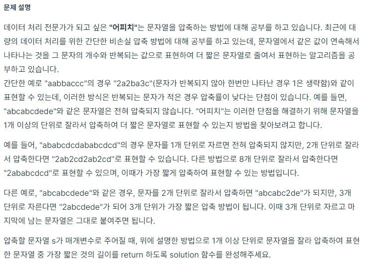 위의 것을 구현하려면 압축크기가 1, 2, 3 ... s.length()/2 까지 경우 하나하나를 생각해야하고
