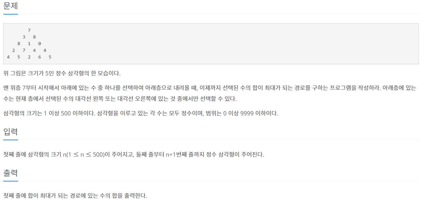 위의 식을 이용해 문제 예시의 삼각형에 있는 7부터 시작하여 마지막값 까지 값을 누적시켜가며 dp 배열에 저장해 놓고