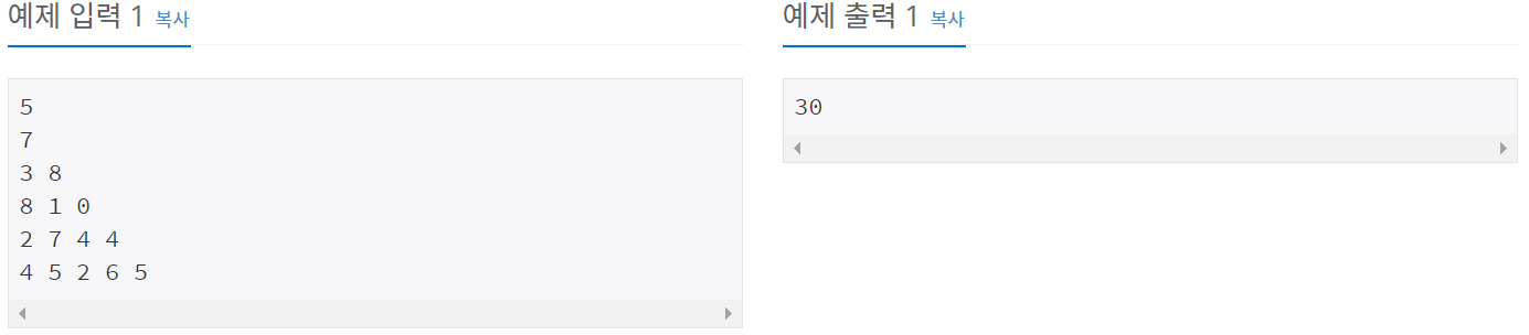 첫째 줄에 삼각형의 크기 n(1 ≤ n ≤ 500)이 주어지고, 둘째 줄부터 n+1번째 줄까지 정수 삼각형이 주어진다.