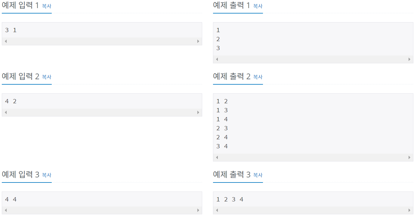 참고로 처음에 나는 문제 이해를 중복제외한 모든 수열이 출력되고 출력된 수열을 오름차순 하는건줄 알고 예제 출력이 잘못됐나 생각했는데,