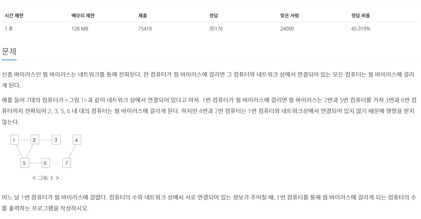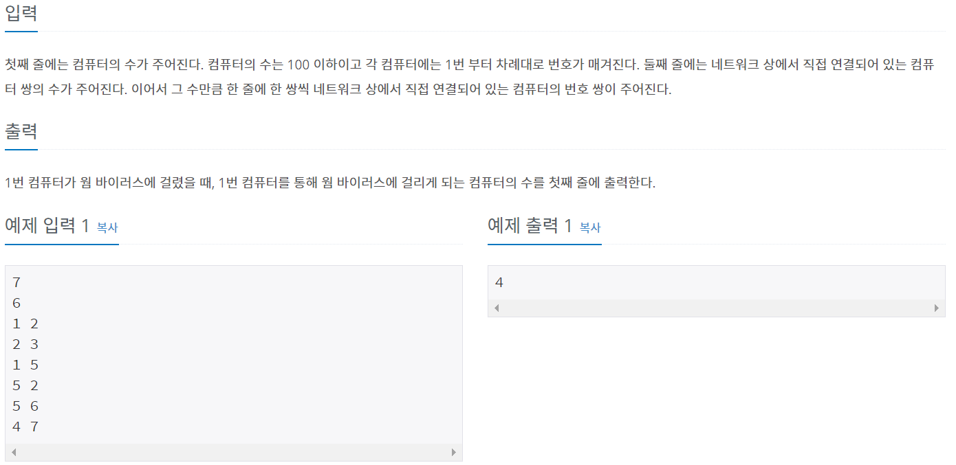 전에 풀었던 'DFS와 BFS' 문제를 이용하면 되는 문제이다. 바이러스에 감염된 시작 컴퓨터에서 부터 간선이 연결된 컴퓨터들만 연결되는 것이므로 시작 컴퓨터로부터 간선이 이어지지 않은 컴퓨터는 신경 쓸 필요가 없다고 생각한다. 어차피 재귀 과정에서 간선이 연결된 것들만 방문하면서 바이러스 감염여부를 판단하기 때문!!