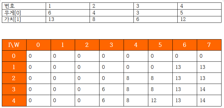 우리가 구하고자 하는 값은 가치 합의 최대를 찾는것이다. 즉, 두번째 표에서 4행 7열에 14라는 값을 찾으면 되는 것이다. 참고로 두번째 표에서 행은 물건번호, 열은 가방이 감당 가능한 무게를 나타낸다.