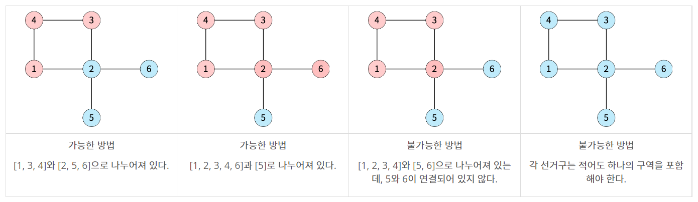아래는 백준시를 두 선거구로 나눈 4가지 방법이며, 가능한 방법과 불가능한 방법에 대한 예시이다.